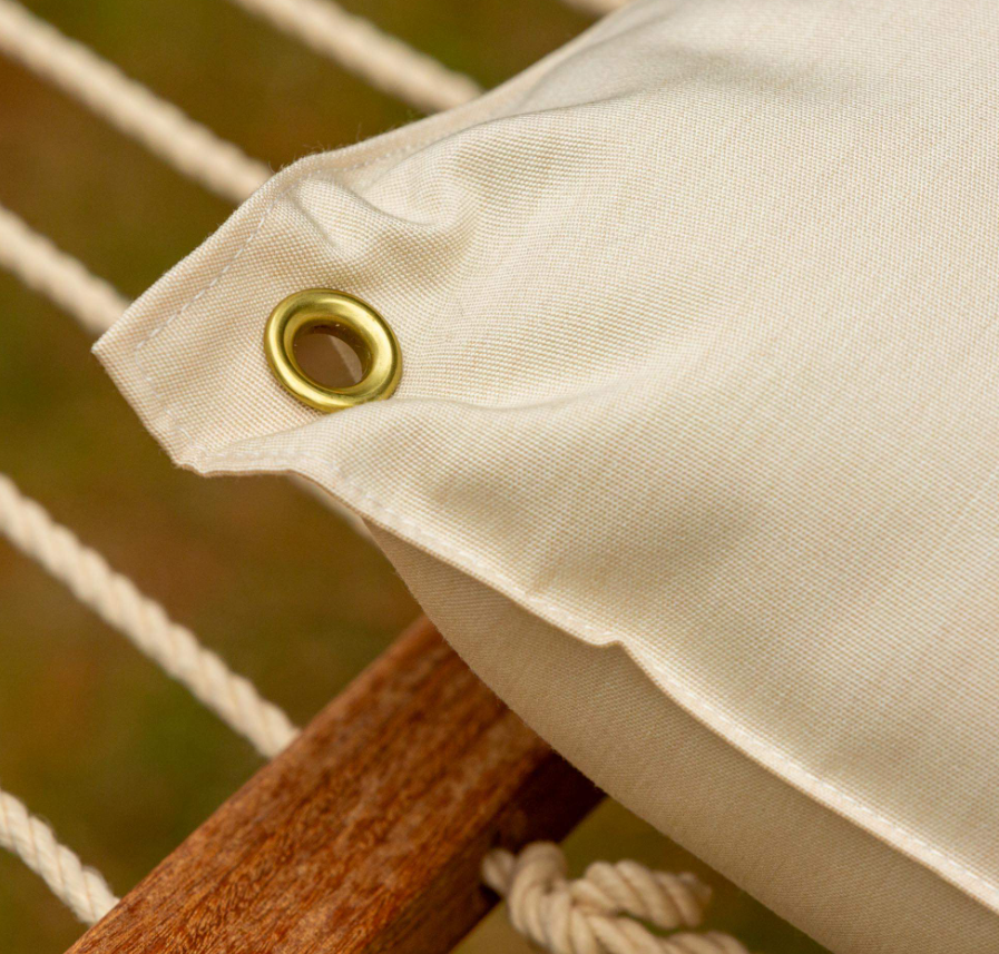 All-weather Sunbrella® or DuraCord® fabric; recycled polyester hollowfill fiber for padding, brass-plated rolled-rim steel grommets |