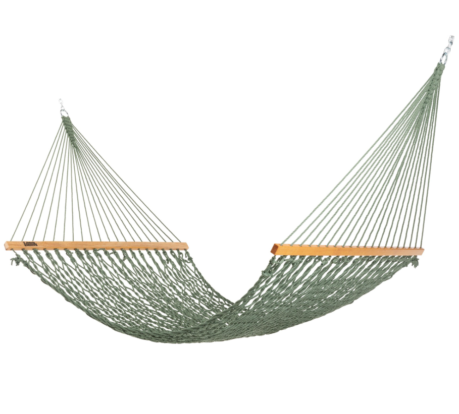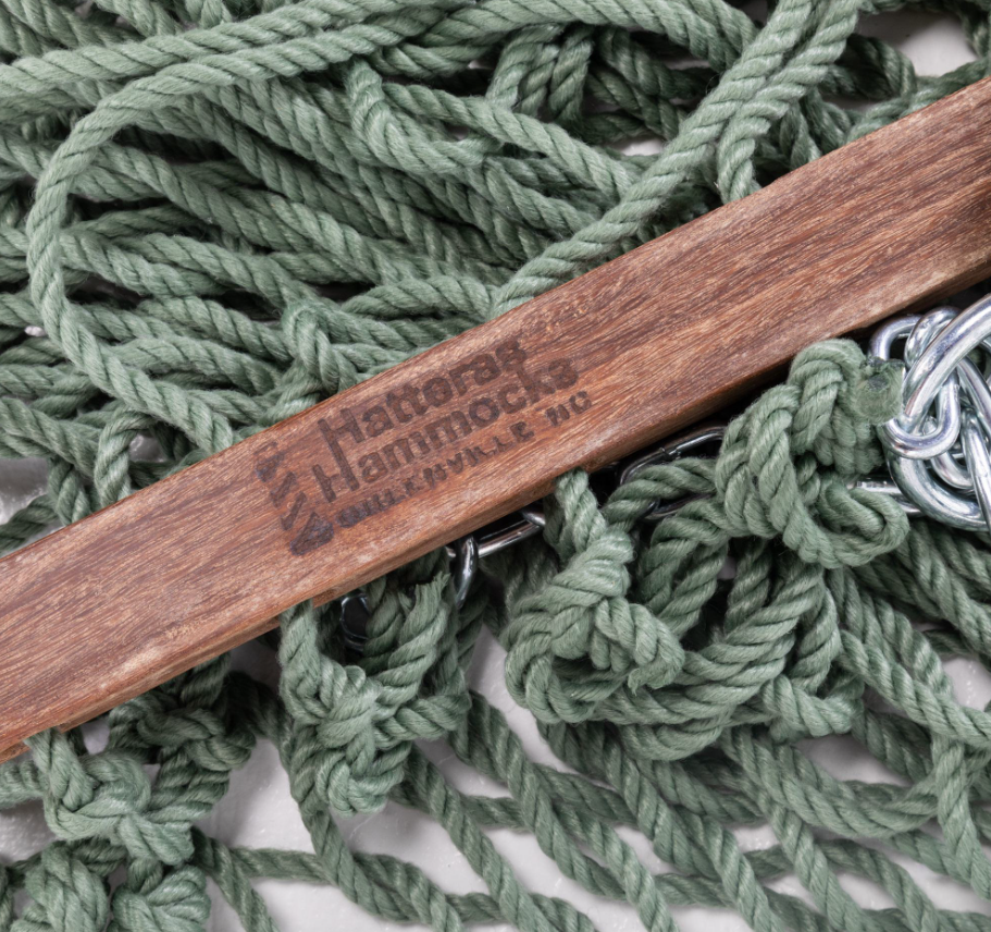 Spreader bars are constructed of unfinished South American cumaru, of the densest and handsomest woods in the world, for premium durability and strength. Spreader design enhances gentle swaying motion. Hatteras Hammocks® logo is branded on each spreader bar, representing strength and durability of Cape Hatteras Lighthouse. Hammock comes complete with superior constructed hardware. Heavy-duty zinc chromate hardware resists rust. One piece welded ring and chain prevents loss of hardware and provides for easy adjustment of hammock height. Two inch diameter ring and welded chain ensure safety. Zinc-plated eyebolt and hook assembly is the largest in the industry for added protection and strength.